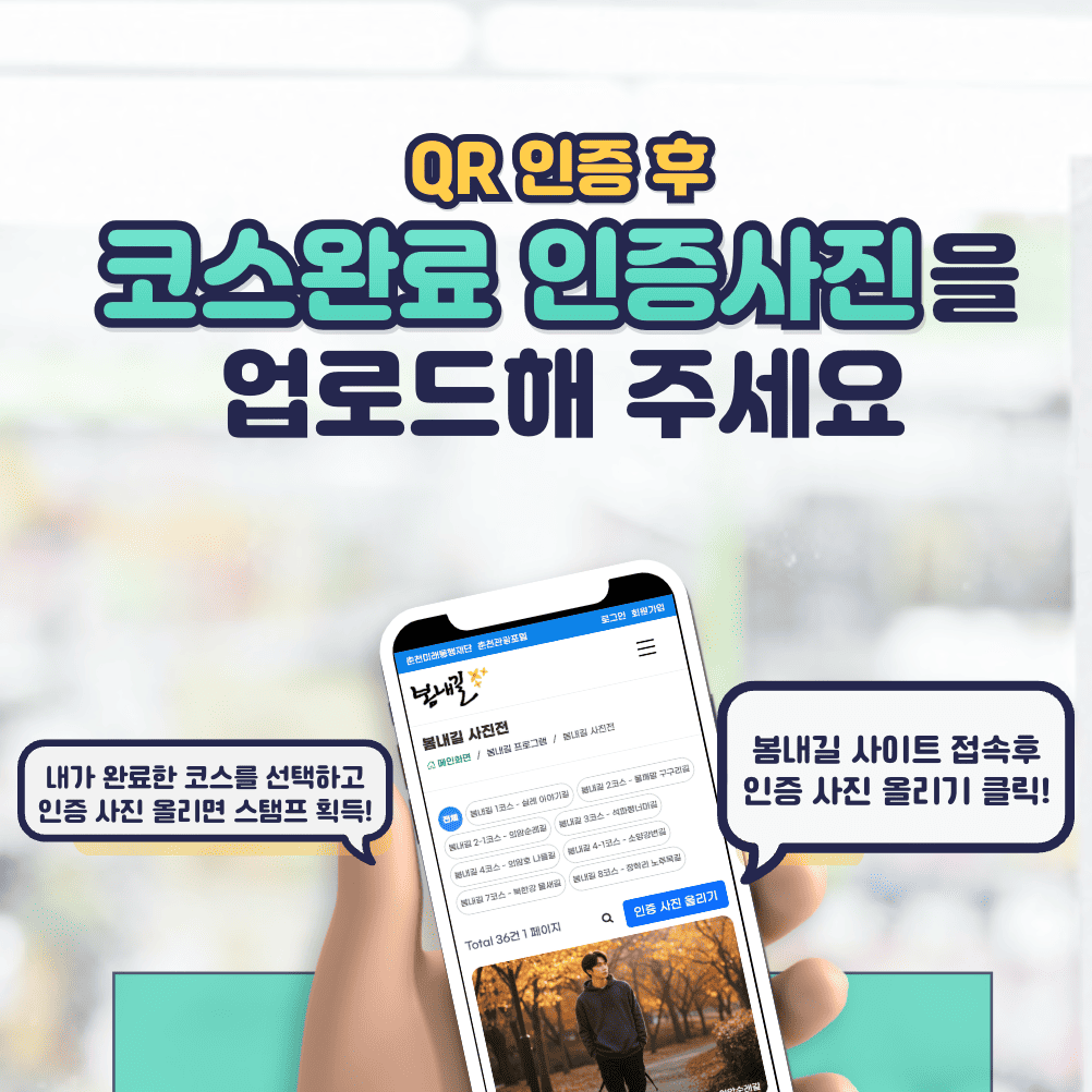 봄내길의 각 코스에 인증QR을 스캔해서 완주 스탬프를 찍어서 완주 인증서를 받아보아요.