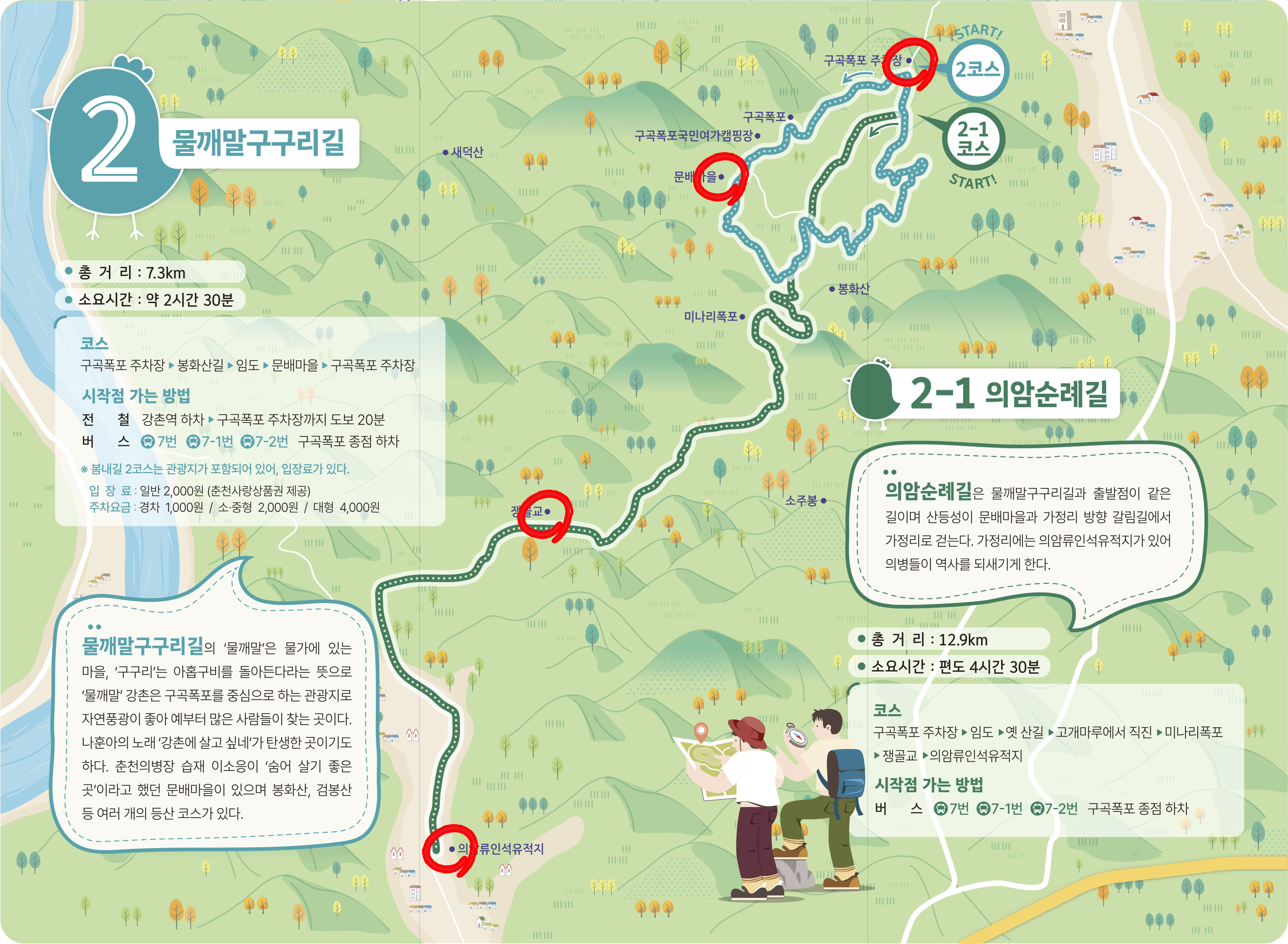 - 코스 시작점인 구곡폭포 관광지에서 봉화산 산등성이까지 오르막길 구간이 있으며 주로 산길을 걷는 코스